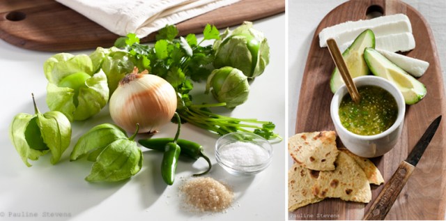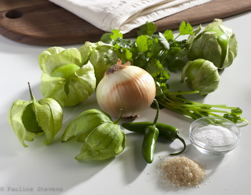 Wash and peel tomatillos. In a small saucer, boil tomatillos and Serrano pepper until tomatillos are soft but not breaking (10 minutes)