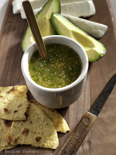 Conchita’s green salsa is most definitely one of my “this is good” recipes. Who would guess a simple salsa would make it? Maybe it’s the small hint of sweet or the combination of uncooked and cooked ingredients. It has nothing to do with fancy ingredients or complicated methods but, when just made, this simple salsa goes straight to my “Wow” hall of fame!