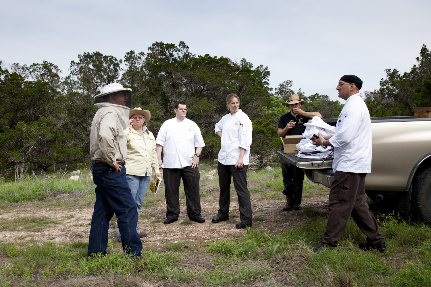 It was cool  to see the enthusiasm Mark received from the hotel’s staff.  A group of chefs  got dressed in the proper gear to join Mark and Bethany.  They helped spot the Queen and held frames (filled with busy bees) while Mark made sure everything looked OK.  Later I learned some of the staff even bought their own gear to visit the bees while Mark was visiting other locations.