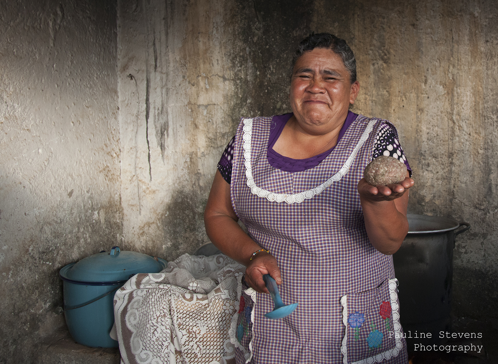 It is fun to watch women working together.  There is always laughing, singing and , of course, a little gossiping as well.  In this group of  five, Doña Teofila is clearly “in charge”.  Two hundred guests and 1,000 meatballs will be prepared.    With her blue spoon in hand, Doña Teofila  gives the orders and the rest of the ladies apply.   She knows the recipe and what has to be done, and everyone knows she rules the place, after all,  she holds the blue spoon.